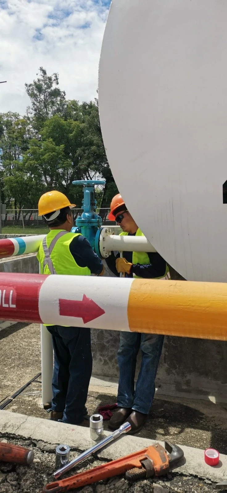 Procedimiento de mantenimiento y control de flujo en una instalación de almacenamiento de combustible de aviación, el acoplamiento entre la válvula y la línea de descarga se realiza mediante bridas empernadas. Nuestro personal técnico, aparece interviniendo precisamente en estos puntos de conexión para asegurar la estanqueidad o realizar el desacoplamiento de la línea.